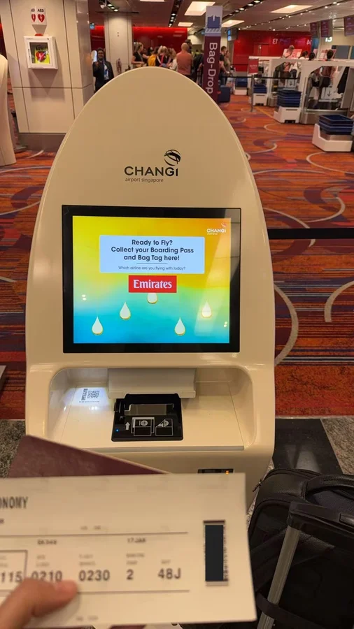 我是凌晨从新加坡出发的,机票是从迪拜中转的emirates航空的,发现樟宜机场的自助值机这次终于能正常使用了,试了下居然顺利取到了登机牌,而且选的还是比较好的twin seats(见后图)。