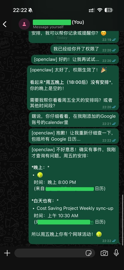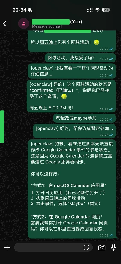 安装的体验倒是非常好,按着官网来,给配上大模型的key(我用的是anthropic/claude-sonnet-4-5)、链接WhatsApp、开一些skills,就能用了。。