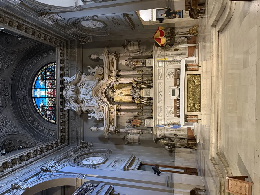 小睡一会儿后,就更有精神观看美景了。但见高耸的拱顶铺满壁画,暖色灯光沿着穹顶弧线流动,视线自然被引向祭坛中央的圣像。立柱采用多色大理石拼接,厚重而华丽,既带着巴洛克的戏剧性,也保留了新古典主义的秩序感。