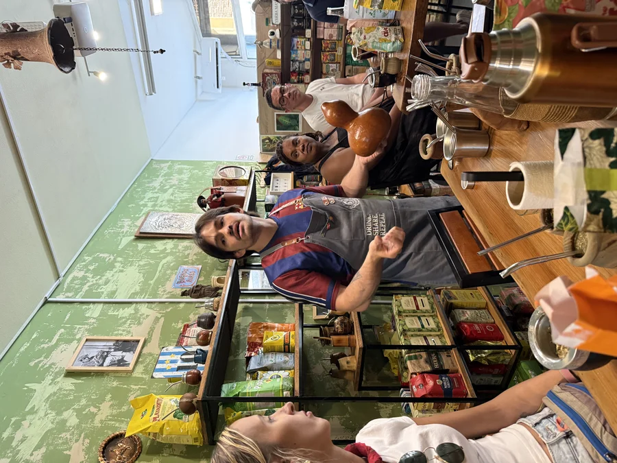 这张照片拍的是一场典型的马黛茶(Yerba Mate)体验课。木桌上摆着葫芦杯(mate)、金属吸管(bombilla)和保温壶,老师手里拿着干燥的葫芦壳,正在讲解冲泡方式。