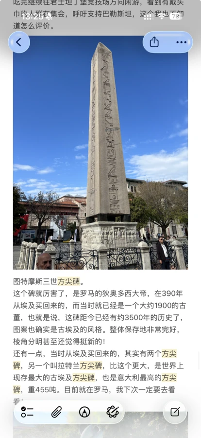 这座高达67米的方尖碑像一根垂直插入天空的坐标轴。它建于1936年,为纪念城市第一次升起阿根廷国旗的地点。四面几乎没有装饰,只在基座刻着简洁的铭文,线条冷静而克制,在周围新古典主义建筑的包围下显得格外现代。站在这个方尖碑下,我想起了当年去土耳其看到的方尖碑,也很有意思。当时的游记写在了备忘录里: